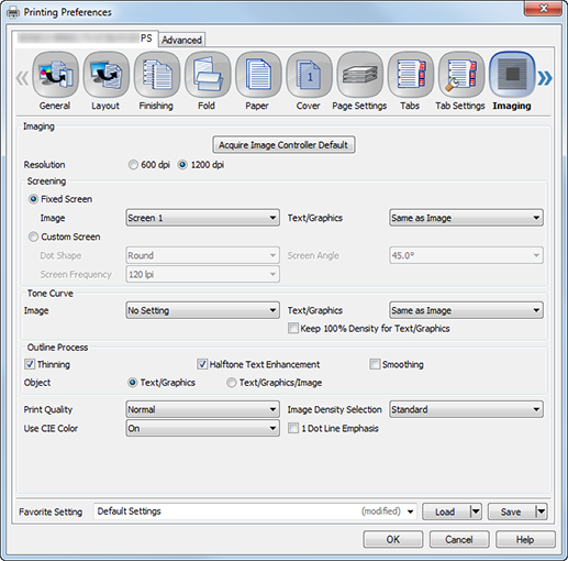 When turned on, you can smoothly print the outline of text with density of 100%, such as K=100%, and line images. The Smoothing setting is available when Fixed Screen is selected.