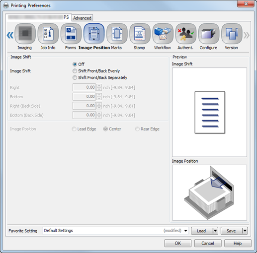 Image Shift | Off, Shift Front/Back Evenly, Shift Front/Back Separately | Set this to shift the print image position horizontally or vertically. Right: Shifts the output image horizontally. (Positive value: shift to the right, negative value: shift to the left) Bottom: Shifts the output image perpendicularly. (Positive value: shift to the bottom, negative value: shift to the top) |
