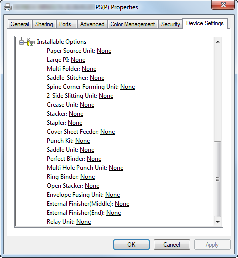 To open the Device Settings screen, right-click the printer icon on the Devices and Printers window (or Printers window or Printers and Faxes window), and specify Printer Properties (or Properties).