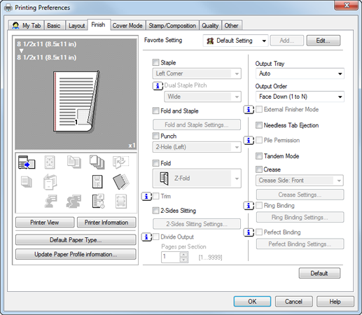 Output Tray | Auto, Stacker Auto, Stacker 1 Main Tray, Stacker 1 Sub Tray, Stacker 2 Main Tray, Stacker 2 Sub Tray, Stacker 3 Main Tray, Stacker 3 Sub Tray, Multi Folder Main Tray, Multi Folder Sub Tray, Saddle-Stitcher Sub Tray, Stapler Main Tray, Stapler Sub Tray, Perfect Binder Sub Tray, External Finisher(End of Config.), External Finisher(Middle of Config.), Open Stacker Main Tray, Relay Unit 3A Sub Tray, Relay Unit 3B Sub Tray | Select the tray to output the printed pages. Selectable items vary depending on the mounted optional device. |