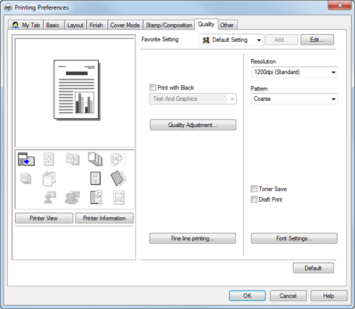 Fine line printing | - | Specify the following fine line printing types. Smoothing Smoothly prints the outline of text with density of 100%, such as K=100%, and line images. Thinning Select this check box to control the boldness of the text or line images. ![]() Emphasis The outline of text in gray and figures are printed sharply. |