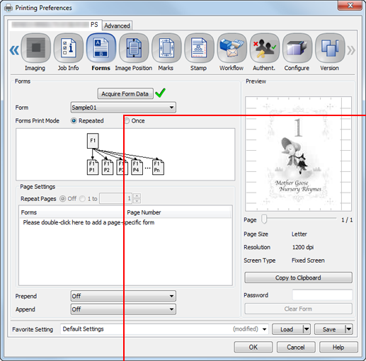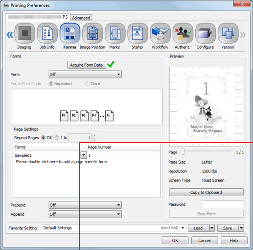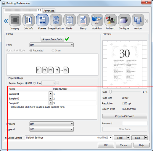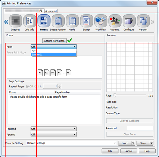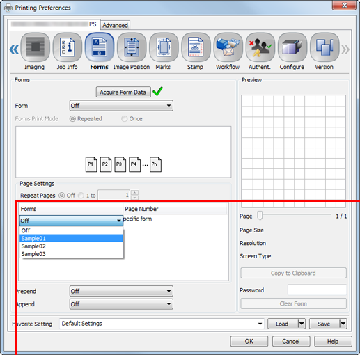supplementary explanationIf the resolution of the form is different from that of the job, the form name is dimmed, which means the form is not available.