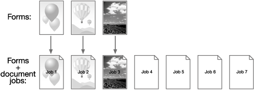When a form has two pages, form page 1 is assigned to the first page of the job, form page 2 is assigned to the second page of the job, and no form page is assigned to other pages as shown below.