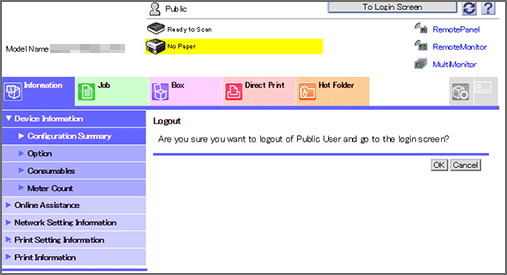 Message Are you sure you want to logout of Public User and go to the login screen? is displayed. Click OK.