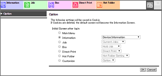 Job | Displays the Job tab after login. You can select which screen in the Job tab you want to display. |