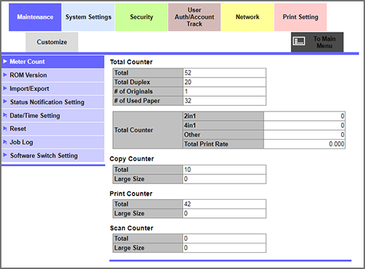 Meter Count | Enables you to check the meter count of this machine. For details, refer to Counter. |