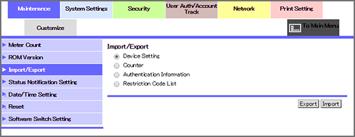 Select Device Setting, Counter, Authentication Information, or Restriction Code List as a file to be transferred from the machine to the computer, then click Export.