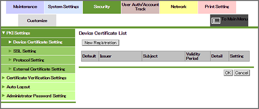 PKI Settings | Specifies the settings about certificates. Specifies the settings of device certificates, SSL, device certificates assigned to a protocol, and external certificates. For details, refer to About Device Certificate Setting, PKI Settings: SSL Setting, About Protocol Setting, and About External Certificate Setting. |