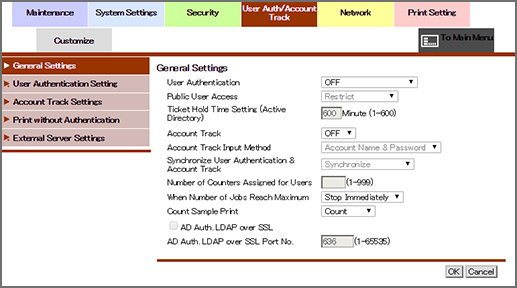 Specify whether or not to activate the account track function on the machine. Selecting ON sets the machine to ask the account authentication procedure before use.