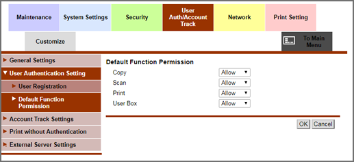 Click User Authentication Setting - Default Function Permission on the menu of User Auth/Account Track tab to display this screen. This setting is available only when the User Authentication is set to ON (External Server).
