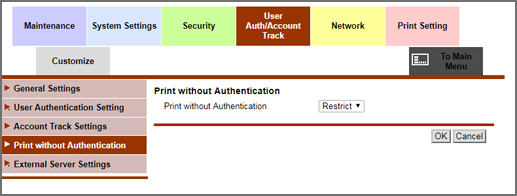 Click Print without Authentication on the menu of User Auth/Account Track tab to display this page.