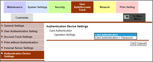 In Authentication Device Settings - Operation Settings, select Card authentication or Card Authentication + Password.