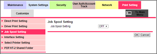 Click Job Spool Setting on the menu of Print Setting tab to display this screen. This setting can be made also from Controller on the MACHINE screen. For details about the setting, refer to Spool Print Jobs in HDD before RIP.