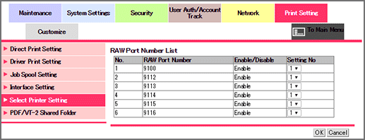 This screen allows you to assign the printer settings specified in Default Setting to each of six RAW port numbers.