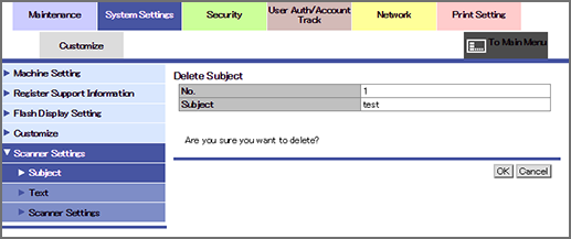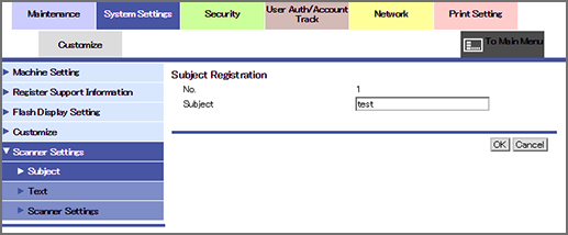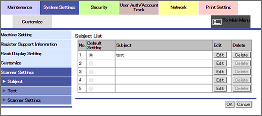This screen allows you to edit or delete the subject of e-mail. When Default Address is set to E-mail in User Setting - Scan Setting - Scan Address Default Setting on the Utility menu, the subject that is selected during scanning is specified.