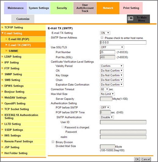 This screen allows you to make the settings on E-mail transmission by SMTP. The settings described in this section are always required if you want to use Scan to E-mail.