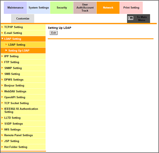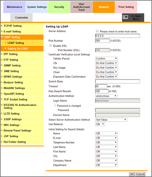 Click LDAP Setting - Setting Up LDAP on the menu of Network tab to display this screen.