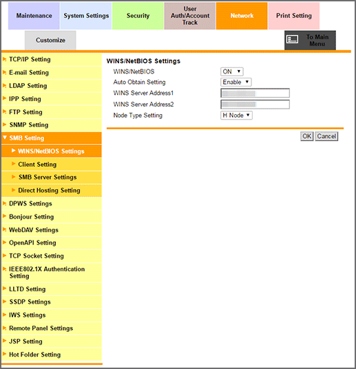 Click SMB Setting - WINS/NetBIOS Settings on the menu of Network tab to display this screen.