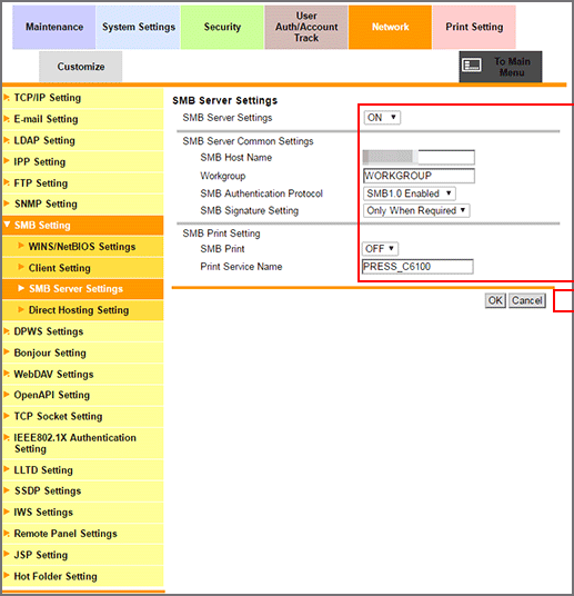 To use the machine as an SMB server, select ON from the SMB Server Settings drop-down list.