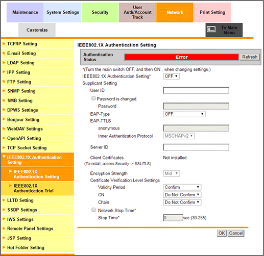 Click IEEE802.1X Authentication Setting - IEEE802.1X Authentication Setting in the Network tab to display this screen.