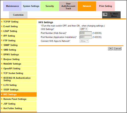 This screen allows you to select whether to use Internal Web Server (IWS). Using IWS function enables to transfer a print data conversion application to the machine and use the print data conversion function and other functions.