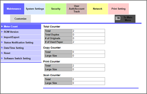 When you click the To Main Menu tab, menu items that can be used in user mode are shown on a single screen.