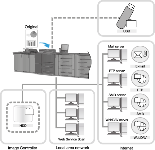 You can send the scan data as an E-mail attachment file, upload to an FTP server, SMB server, or WebDAV server, or save to an HDD or USB flash drive. The scan data saved to the HDD can be imported to network-connected computers by using the TWAIN-compliant applications and the HDD TWAIN driver.