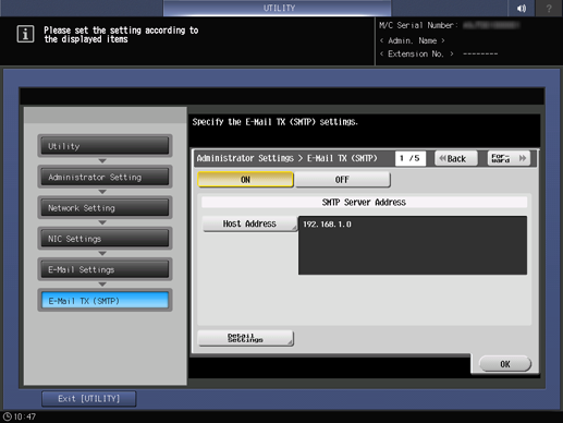 5. If necessary, press Detail Settings, specify other items such as SMTP Authentication, and press OK.