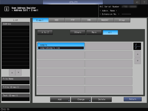 3. Press E-mail, HDD, FTP, SMB, WebDAV, or Group to display a destination to change its information.