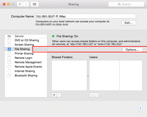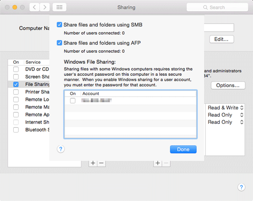 Click Options, check that the Share files and folders using SMB check box is selected, and click Done.