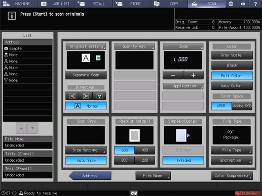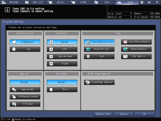 You can set separate scan, bind direction of two-sided original (whether the top and bottom of both sides are the same, or one side is flipped vertically), original orientation, original type, etc.