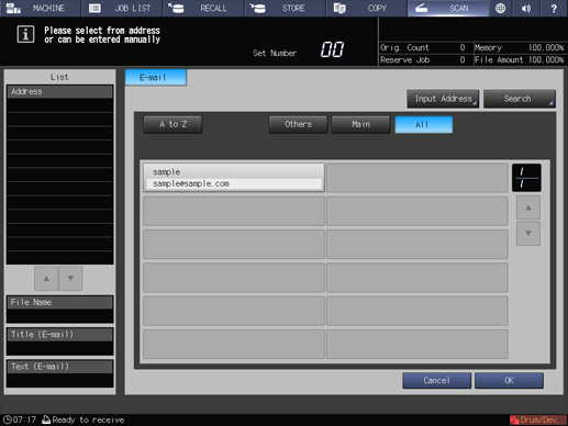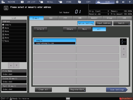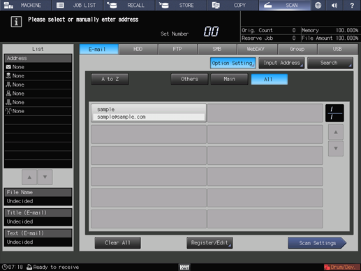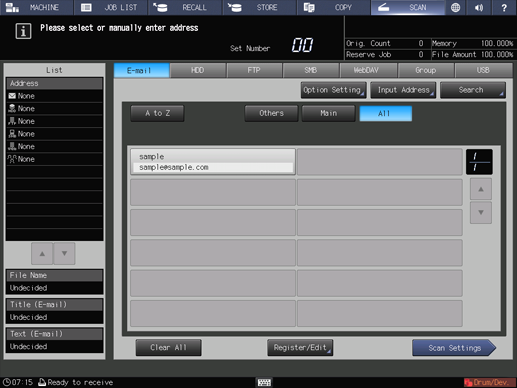 supplementary explanationAs default, the E-mail address list is displayed. For details about the default destination tab on the SCAN screen, refer to Administrator Setting: Scan Setting.