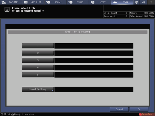 To set a subject to the E-mail, press Title Setting, press 1 to 5 or Manual Setting to set the subject, and then press OK.