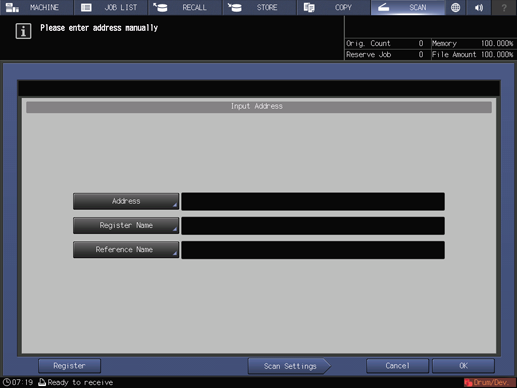 supplementary explanationThe settings on the Scan Settings screen and the address selected on the SCAN screen may remain until the machine is restarted. It is recommended to release the setting and address once the operation is completed.