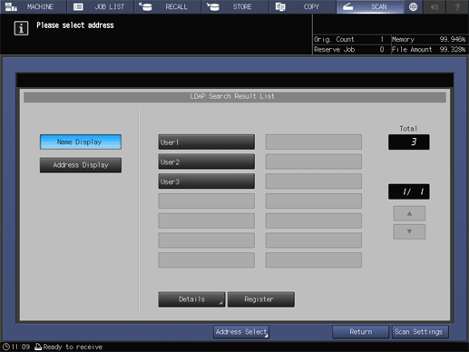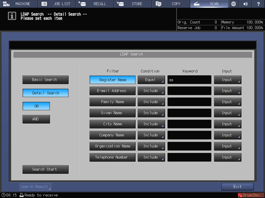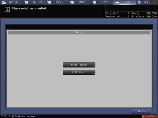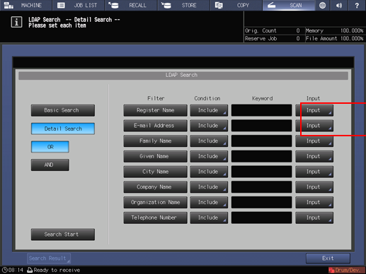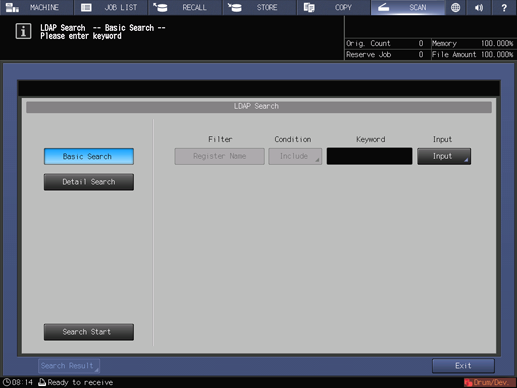 You can acquire the information meeting the search conditions entered on the control panel from the data base in the LDAP server. You can also select the acquired E-mail address, and then send or register the scan data.