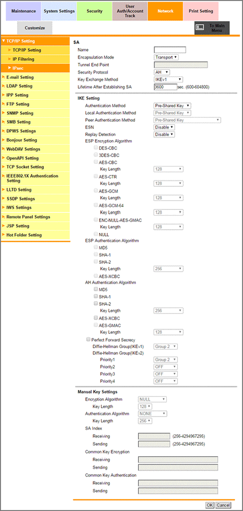 supplementary explanationKey Exchange Method: Select the method that safely generates the common key used for encrypted communication. When using a device that is not compatible with the automatic key exchange by IKE, select Manual Key; you can manually specify detailed parameters.