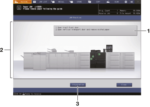Pressing Illustration will display the screen to explain how to clear a paper jam.