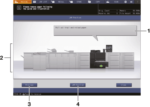 When a paper misfeed occurs in a print or copy job, the machine displays the message Paper JAM and misfeed area(s) on the screen.