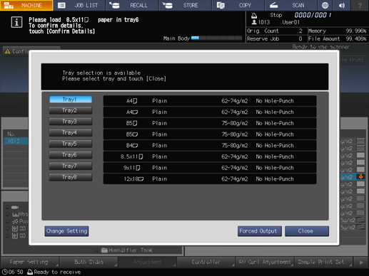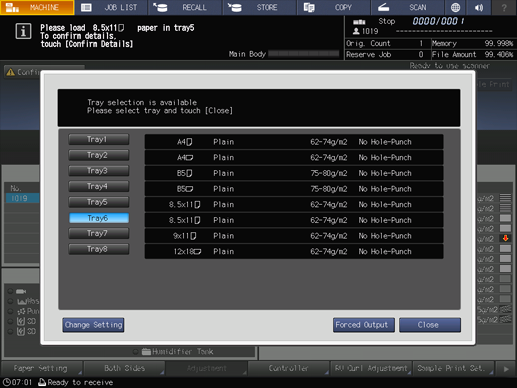 Press a tray key to be used and then press Forced Output.