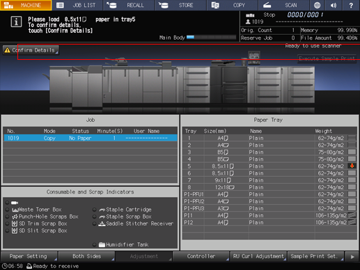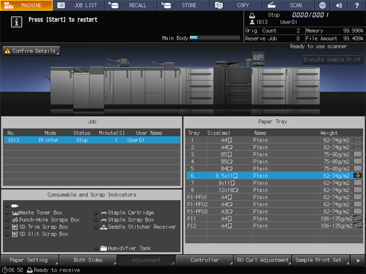 supplementary explanationWhen the tray is replenished with paper, the message changes to Press [Start] to restart.