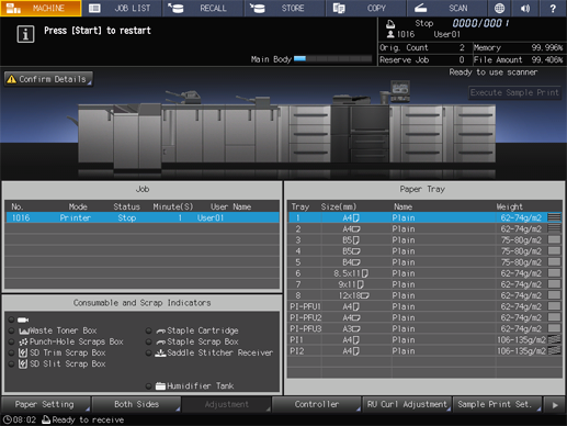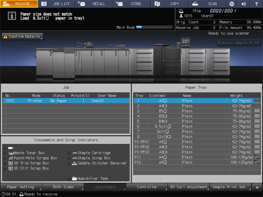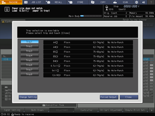 When a tray is specified for the received print data, if the paper size of the specified tray does not match print data, the machine stops temporarily.