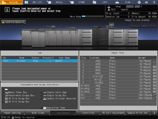 If paper that matches paper conditions that received print data specifies is not loaded in any tray, the machine temporarily stops its operation.