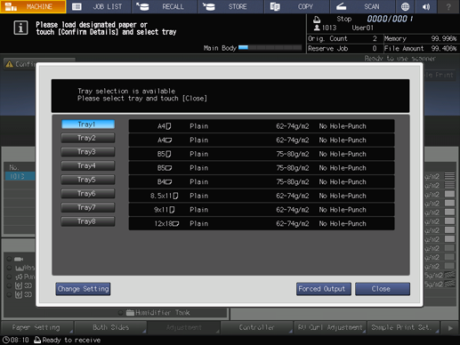 • The tray selected for forced output will be used until that job is completed.