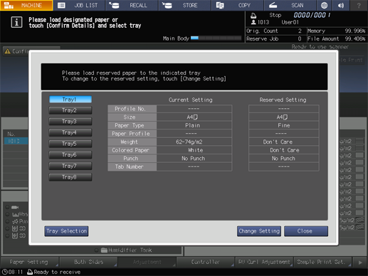The paper setting of the selected tray (Current Setting) and that required by the print data (Reserved Setting) are displayed.