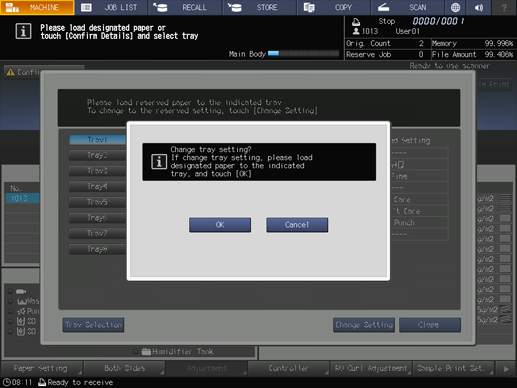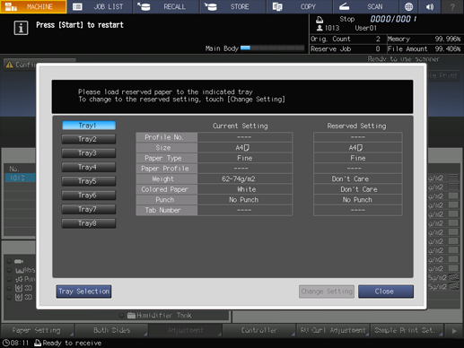 When the message that does not designate a specific tray is displayed, select any tray and change its paper settings (Current Setting) to settings that the print data requires (Reserved Setting). Load the tray with paper that conforms to specified conditions, and then start printing.