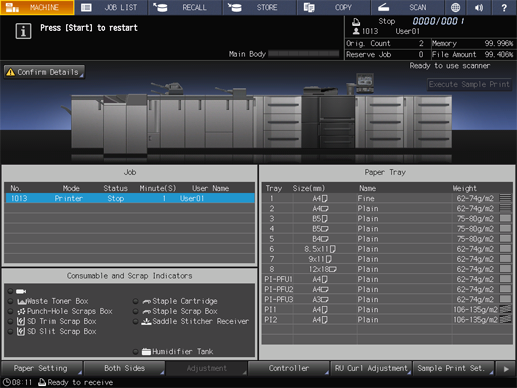 The screen returns to the MACHINE screen and displays the message Press [Start] to restart.