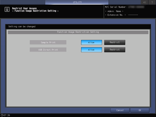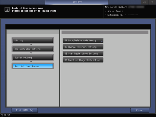 Press System Setting on the Administrator Setting Menu screen, and then press Restrict User Access and Function Usage Restriction in sequence.