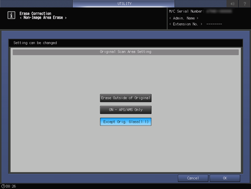 Except Orig. Glass(1:1): Erase the outside area except when making a same-sized copy as the original scanned from the original glass.