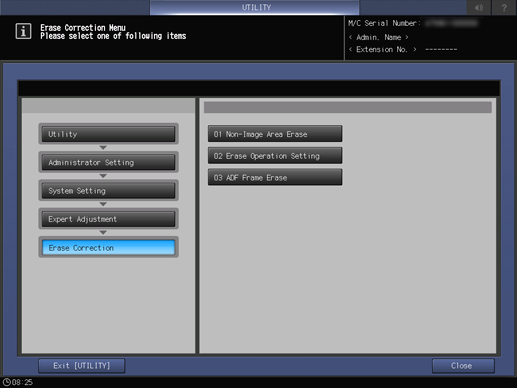 Press System Setting on the Administrator Setting Menu screen, and then press Expert Adjustment, Erase Correction, and Erase Operation Setting in sequence.