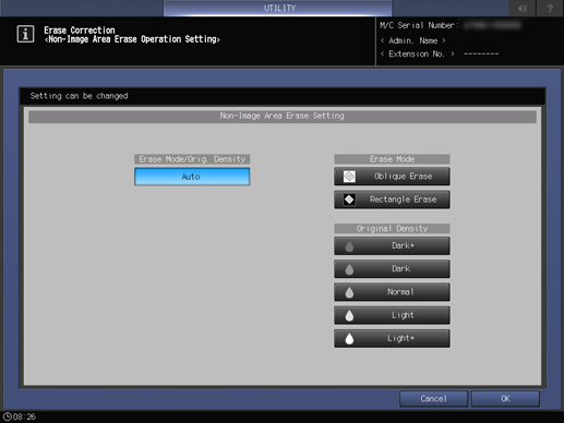 Set Erase Mode and Original Density when No Image Area Erase is selected in Application. The default setting is Auto.